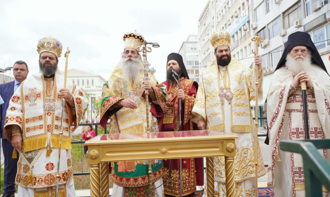 Ακολούθησε η περιφορά του Σταυρού με το Τίμιο Ξύλο και των Αγίων Ισαποστόλων και Θεοστέπτων Βασιλέων Κωνσταντίνου και Ελένης στους κεντρικούς δρόμους της πόλης του Πειραιά.
