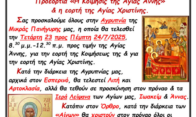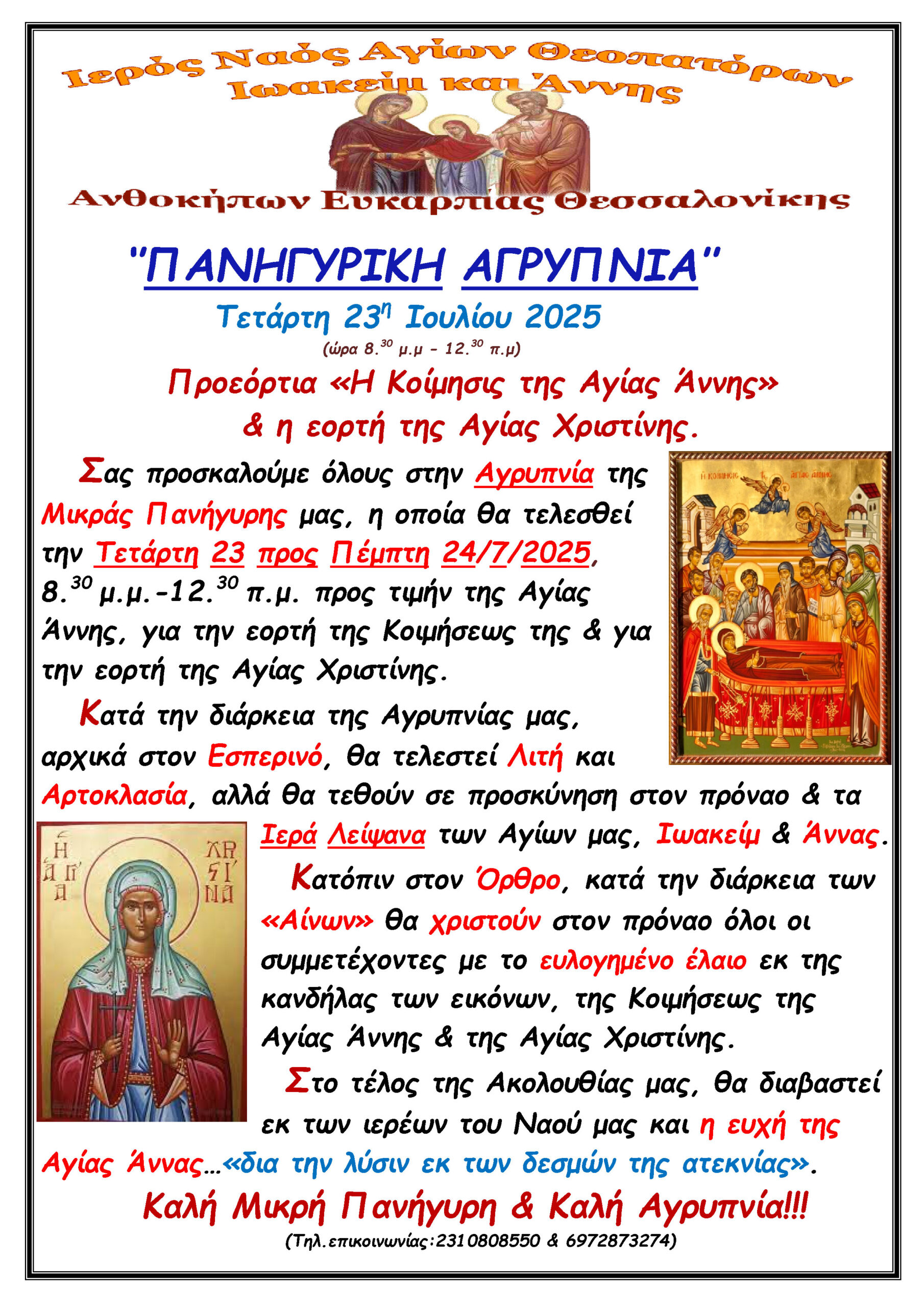Πανηγυρική Αγρυπνία Ι.Ν.Αγίων Θεοπατόρων Ιωακείμ και Άννης Νεαπόλεως