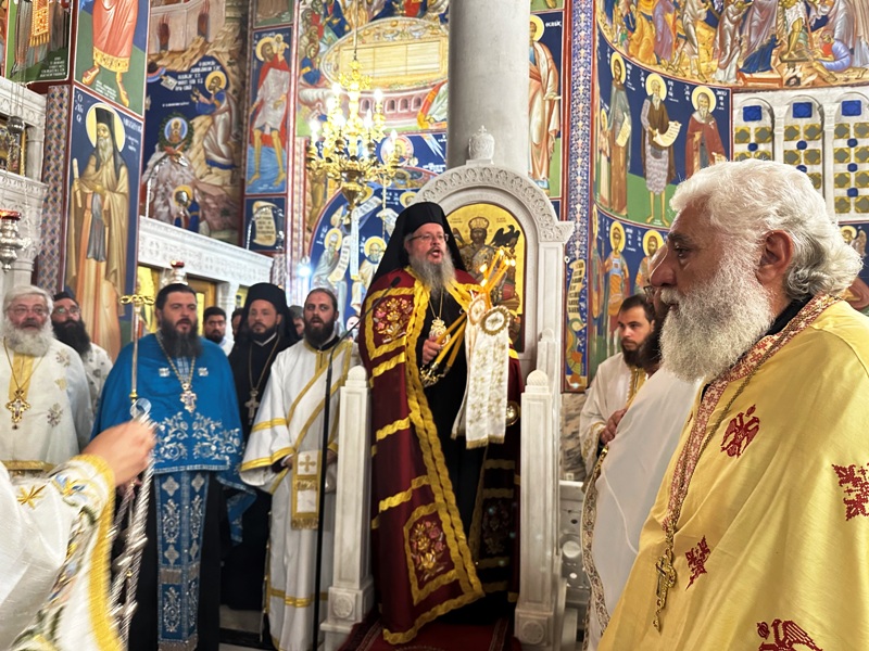 Νωρίτερα, στον αύλειο χώρο του Ιερού Ναού, πραγματοποιήθηκε η υποδοχή της Τιμίας Χειρός του Οσίου Πατρός ημών Αγίου Αρσενίου του εν Πάρω, την οποία κόμισε από την Ιερά Μονή Χριστού Δάσους-Αγίου Αρσενίου Πάρου, ο Ιεροκήρυκας της Ιεράς Μητροπόλεως, Αρχιμ. Αρσένιος Μελισσιανός. Προ του «Νυν απολύεις…» ο Σεβασμιώτατος Μητροπολίτης μας παρουσίασε τους προσκεκλημένους Αγίους Αρχιερείς και τους προσφώνησε με εγκαρδιότητα εκφράζοντας και τις ευγνώμονες ευχαριστίες του για την αποδοχή της προσκλήσεώς του. Εν συνεχεία, τον λόγο έλαβε ο Σεβ. Λαρίσης, ο οποίος αφού ευχαρίστησε εκ μέρους και των υπολοίπων Αρχιερέων, τον Σεβ. Μητροπολίτη μας για την αδελφική πρόσκλησή του, κήρυξε τον θείο λόγο. Μετά το πέρας του Εσπερινού, ακολούθησε Ιερά Αγρυπνία, η οποία ολοκληρώθηκε τις πρώτες πρωινές ώρες.