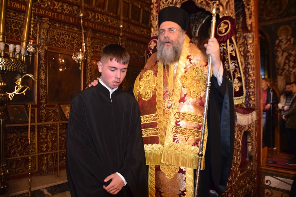 Πριν το τέλος του Εσπερινού ο Σεπτός μας Ποιμενάρχης Χειροθέτησε σε Αναγνώστη τον μαθητή Δημήτριο Αραπογιάννη, υιό του π. Αθανασίου Αραπογιάννη που εφημερεύει στον Ιερό Ναό Αγίου Αθανασίου Αγίας Μονής Τρικάλων και παραλλήλως το καλοκαίρι στο ορεινό Γαρδίκι.