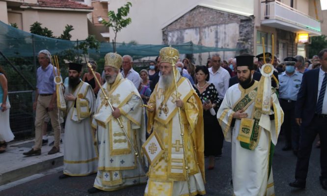 Εχθές, παραμονή τῆς ἑορτῆς τελέσθηκε Ἀρχιερατικός Μέγας Ἑσπερινός μέ τόν Μητροπολίτη Ναυπάκτου κ. Ἱερόθεο καί τόν Μητροπολίτη Ἰταλίας κ. Πολύκαρπο μέ ἀρτοκλασία καί θεῖο κήρυγμα στήν κεντρική πλατεία τῆς πόλης καί λιτανεία στίς ὁδούς.