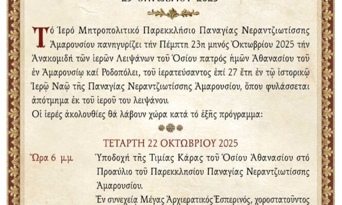 Πανήγυρις Ανακομιδής Ι. Λειψάνων Οσίου Αθανασίου στο Μαρούσι Δόγμα 17 Οκτωβρίου 2025 14:45 Tags: ΜΗΤΡΟΠΟΛΗ ΚΗΦΙΣΙΑΣ