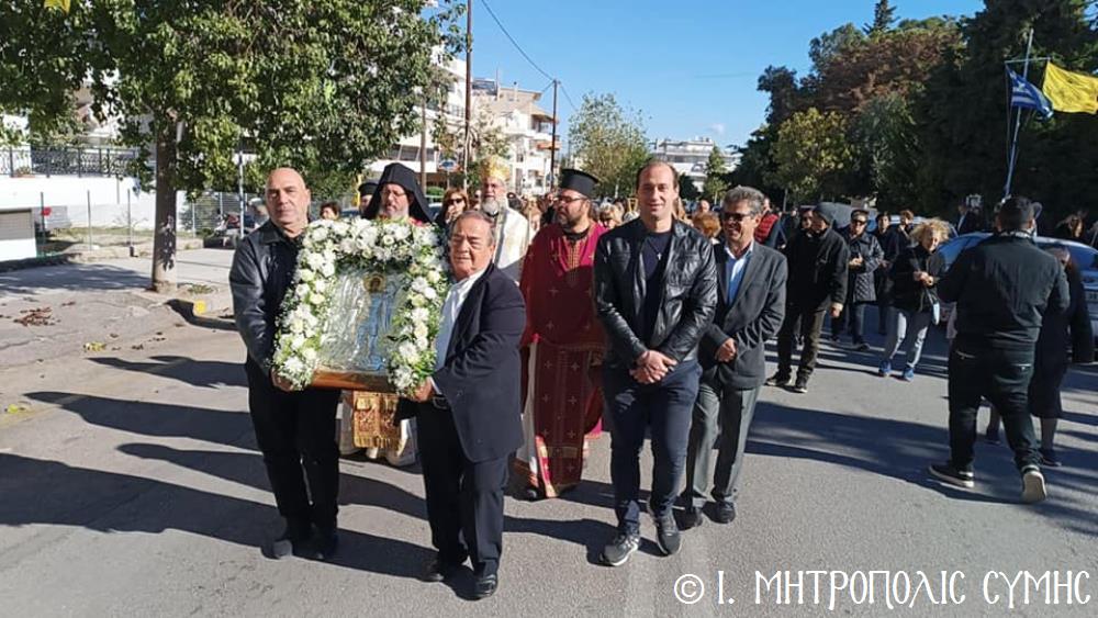 Σήμερα τό πρωΐ, Κυριακή 24η Νοεμβρίου, ὁ Σεβ. Μητροπολίτης μας κ. Χρυσόστομος, κανονικῇ ἀδείᾳ καί προτροπῇ τοῦ οἰκείου Σεβ. Μητροπολίτου Ρόδου κ. Κυρίλλου, χοροστάτησε εἰς τόν Ὄρθρο καί τέλεσε τήν Θεία Λειτουργία στόν Ἐνοριακό Ἱερό Ναό Ἀναλήψεως τοῦ Σωτῆρος πόλεως Ρόδου, εὐλόγησε τήν προσφερομένη Ἀρτοκλασία τοῦ Συλλόγου, ἐνῶ στό τέλος προέστη τῆς λαμπρᾶς Λιτανείας, πέριξ τοῦ Ἱ. Ναοῦ, τῆς Εἰκόνας τοῦ Ταξιάρχου Μιχαήλ τοῦ Πανορμίτου, ἀντιγράφου τῆς πρωτοτύπου, πού φυλάσσεται πρός εὐλογία τῶν Μελῶν τοῦ Συλλόγου στό «Συμιακό σπίτι». Συλλειτούργησαν, ὁ Πανοσιολ. Καθηγούμενος Ἀρχιμανδρίτης τοῦ Οἰκουμ. Θρόνου Ἀντώνιος Πατρός, ὁ Πανοσιολ. Ἀρχιμανδρίτης Ἰωαννίκιος Ἀναγνώστου, Ἱερατικῶς Προϊστάμενος τῆς Ἐνορίας καί ὁ Ἱεροδιάκονος Παῦλος Τερεζάκης.