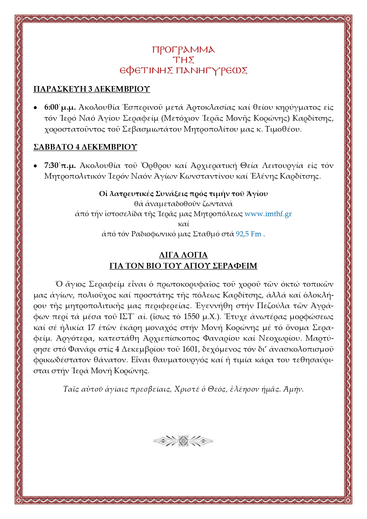 Το Πρόγραμμα της εορτής και Πανηγύρεως του Πολιούχου της Ιεράς Μητροπόλεως Θεσσαλιώτιδος και Φαναριοφερσάλων, αγίου Ιερομάρτυρος Σεραφείμ, Αρχιεπισκόπου Φαναρίου και Νεοχωρίου.