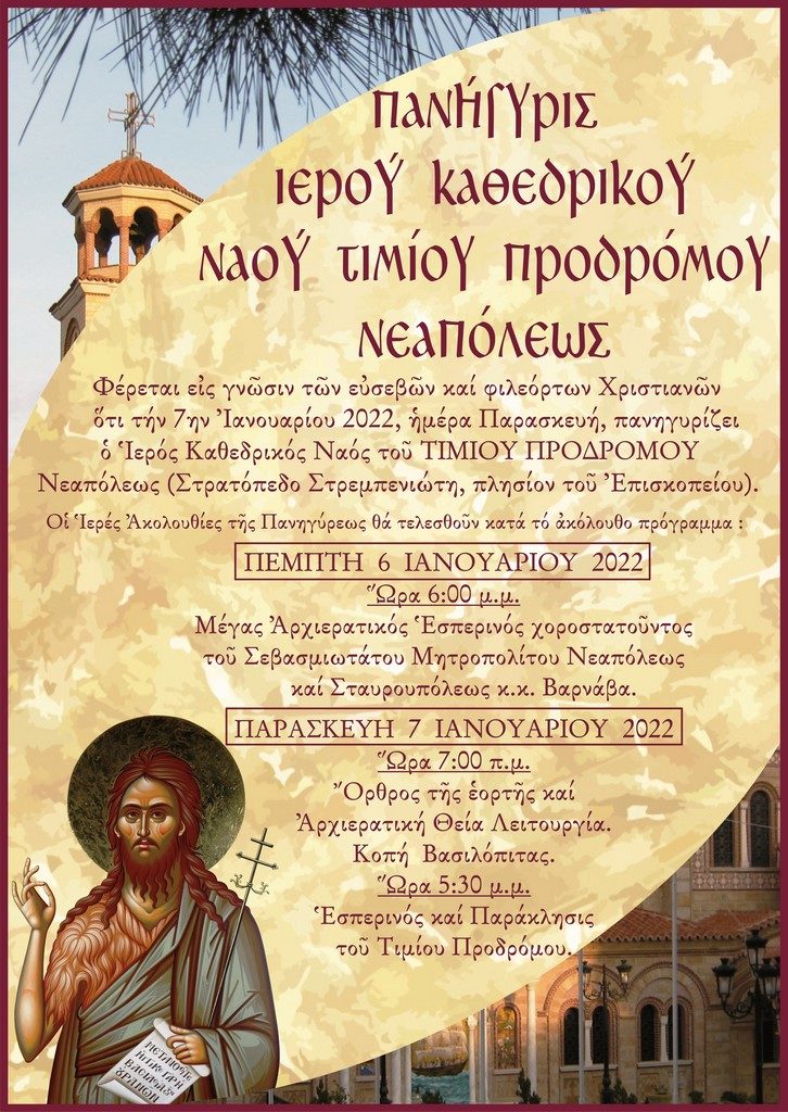 Πανηγυρίζει ο Ι. Καθεδρικός Ναός Τιμίου Προδρόμου, της Ι. Μητροπόλεως Νεαπόλεως και Σταυρουπόλεως, την Πέμπτη 6 και Παρασκευή, 7 Ιανουαρίου, σύμφωνα με το κάτωθι Πρόγραμμα: