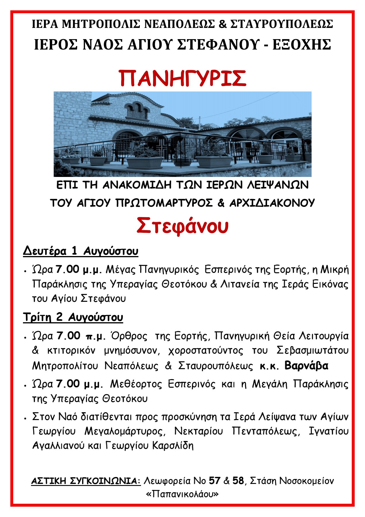 Τη Δευτέρα 1η και Τρίτη 2 Αυγούστου πανηγυρίζει ο Ι. Ν. Αγίου Στεφάνου Νεαπόλεως επί την εορτή της ανακομιδής του Ι. Λειψάνου του Αγ. Στεφάνου.
