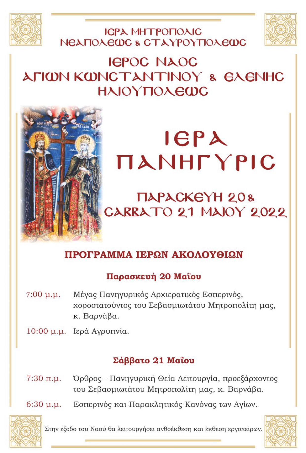 Την Παρασκευή 20 και Σάββατο 21 Μαΐου 2022, πανηγυρίζει ο Ι. Ναός Αγίων Κωνστατίνου και Ελένης Ηλιουπόλεως, της Μητροπόλεως Νεαπόλεως και Σταυρουπόλεως.