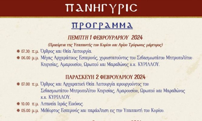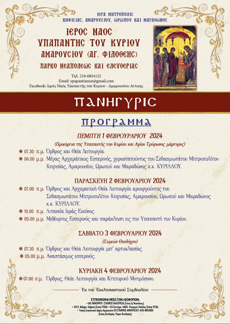 Πανηγυρίζει ο Ι. Ναός Υπαπαντής του Κυρίου στη Φιλοθέη, σύμφωνα με το ακόλουθο Πρόγραμμα: