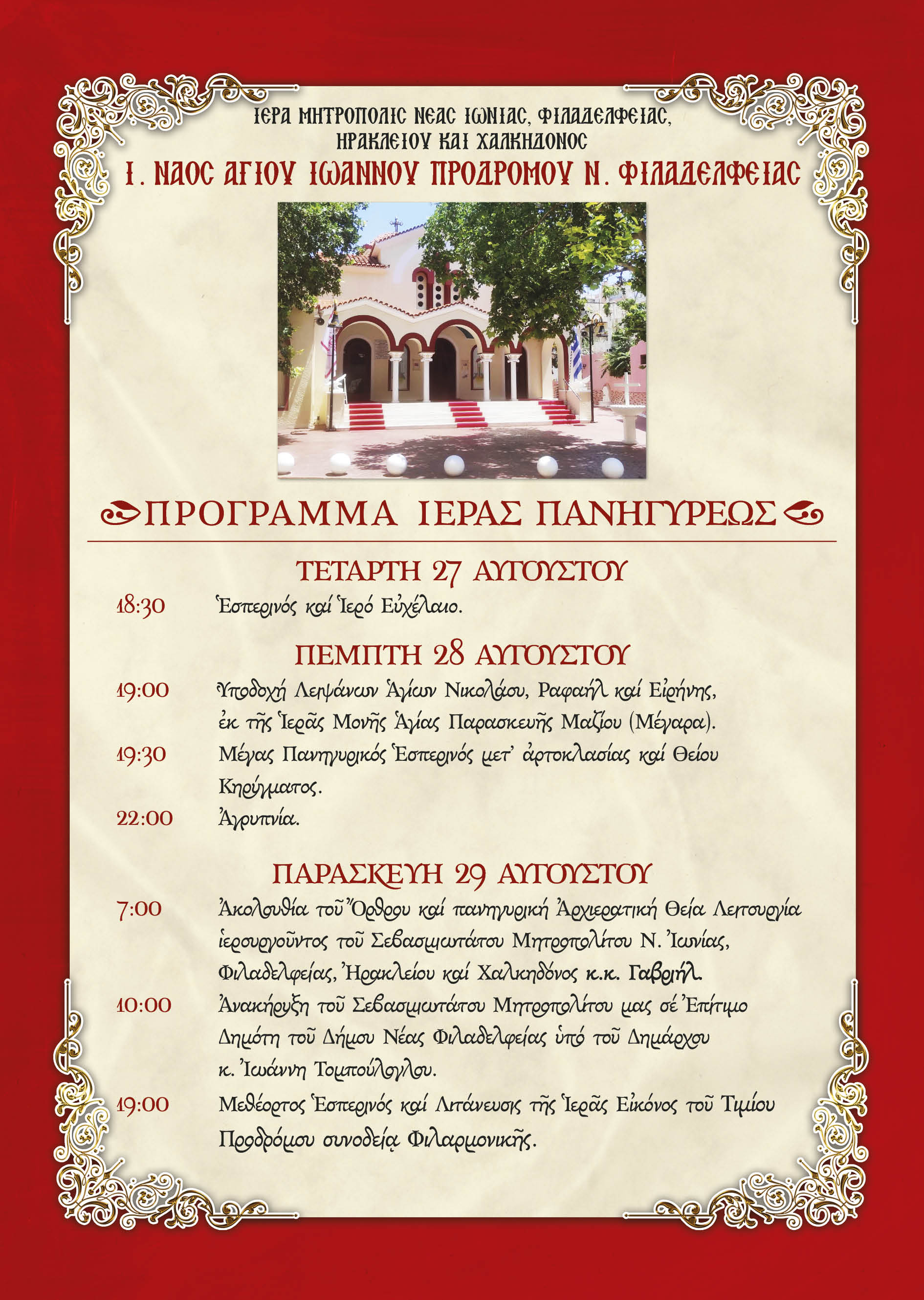 Πανηγυρίζει ο Ιερός Ναός Αγίου Ιωάννου Φιλαδέλφειας, της Μητροπόλεως Νέας Ιωνίας, επί τη Εορτή της Αποτομής του Τιμίας Κεφαλής του Αγίου Ιωάννου του Προδρόμου, σύμφωνα με το ακόλουθο Πρόγραμμα: