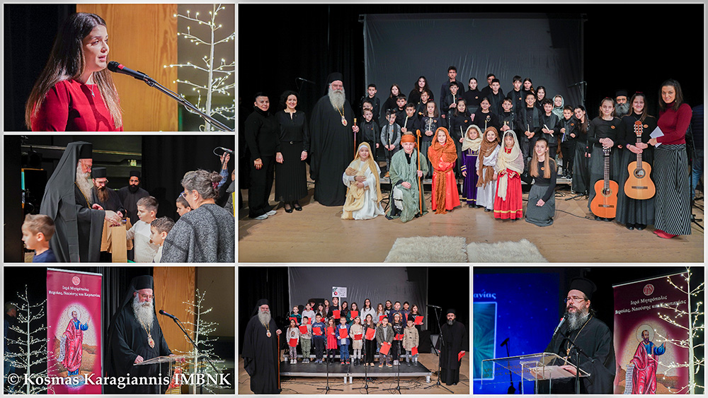 Τις εκδηλώσεις προλόγισε και παρουσίασε ο Γενικός Αρχιερατικός Επίτροπος της Ιεράς Μητροπόλεως, Αρχιμ. Αρσένιος Χαλδαιόπουλος, ενώ ο Βοηθός Επίσκοπος της Μητροπόλεώς μας αναφέρθηκε στη μεγάλη συμμετοχή που είχαν και οι φετινές χριστουγεννιάτικες εκδηλώσεις του Γραφείου Ποιμαντικής Διακονίας και μετέφερε τις ευχές του Ποιμενάρχου μας κ. Παντελεήμονος, λέγοντας μεταξύ άλλων: Λίγες ἡμέρες πρίν νά ἑορτάσουμε τή μεγάλη καί χαρμόσυνη ἑορτή τῶν Χριστουγέννων μεταφερθήκαμε στή χριστουγεννιάτικη ἀτμόσφαιρα τῆς ὡραίας ἐκδηλώσεως πού μέ τόση ἀγάπη καί φροντίδα ἑτοίμασε τό Γραφεῖο Ποιμαντικῆς Διακονίας τῆς Ἱερᾶς μας Μητροπόλεως σέ συνεργασία μέ τούς κατηχητές καί τίς κατηχήτριες μας γιά ὅλα τά παιδιά τῶν κατηχητικῶν συνάξεων τῆς Ἱερᾶς Μητροπόλεώς μας μέ θέμα «Τά κάλαντα τῶν Χριστουγέννων».
