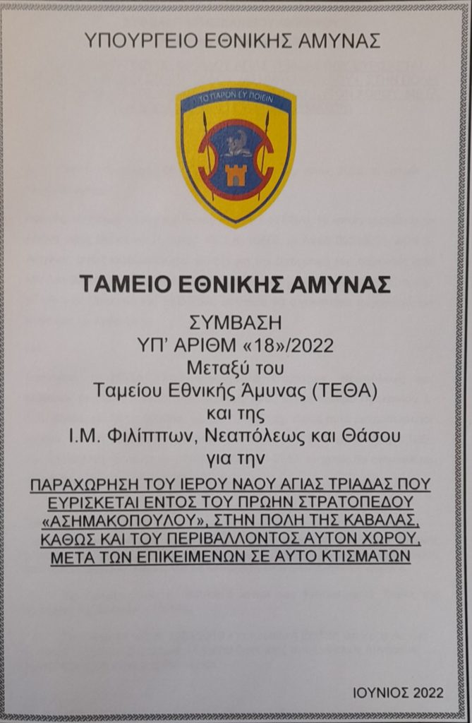 Εξ αρχής υπήρξε η κατανόηση και η καλή διάθεση από μέρους του κ.Υπουργού, ο οποίος ανέλαβε προσωπικά την οριστική επίλυση του χρονίζοντος ζητήματος, ενεργώντας τα δέοντα προς το Γενικό Επιτελείο Στρατού και το Ταμείο Εθνικής Άμυνας (ΤΕΘΑ), μέχρι που η Διοικητική Επιτροπή του ΤΕΘΑ με την υπ’ αριθμ. 7/4-3-2022 απόφαση της (ΑΔΑ : 6ΔΡΑΟΡΛΦ-Π3Β) ενέκρινε την «ΔΩΡΕΑΝ ΚΑΤΑ ΧΡΗΣΗ ΠΑΡΑΧΩΡΗΣΗ, ΕΠ’ ΑΟΡΙΣΤΟΝ, ΣΤΟ ΝΠΔΔ ΙΕΡΑ ΜΗΤΡΟΠΟΛΗ ΦΙΛΙΠΠΩΝ, ΝΕΑΠΟΛΕΩΣ ΚΑΙ ΘΑΣΟΥ» ΤΟΥ ΥΦΙΣΤΑΜΕΝΟΥ, ΕΝΤΟΣ ΤΟΥ ΠΡΩΗΝ ΣΤΡΑΤΟΠΕΔΟΥ ΑΣΗΜΑΚΟΠΟΥΛΟΥ ΙΕΡΟΥ ΝΑΟΥ ΑΓΙΑΣ ΤΡΙΑΟΣ ΚΑΒΑΛΑΣ, ΜΕΤΑ ΤΟΥ ΠΕΡΙΒΑΛΛΟΝΤΟΣ ΧΩΡΟΥ, ΕΚΤΑΣΗΣ ΣΥΝΟΛΙΚΗΣ 4.932,32τ.μ., ΚΑΘΩΣ ΚΑΙ ΤΩΝ ΛΟΙΠΩΝ ΕΠΙΚΕΙΜΕΝΩΝ ΣΕ ΑΥΤΟΝ ΚΤΙΣΜΑΤΩΝ», και απέστειλε προσχέδιο συμβάσεως για τα περαιτέρω.