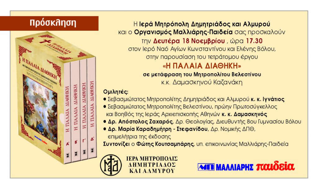 Ομιλητές θα είναι ο Σεβ. Μητροπολίτης Δημητριάδος και Αλμυρού κ. Ιγνάτιος., ο Σεβ. Μητροπολίτης Βελεστίνου κ. Δαμασκηνός, ο δρ. Απόστολος Ζαχαρός, δρ. Θεολογίας, διευθυντής 8ου Γυμνασίου Βόλου, η δρ. Μαρία Καραδημήτρη – Στεφανίδου, δρ. Νομικής ΔΠΘ, επιμελήτρια της έκδοσης.