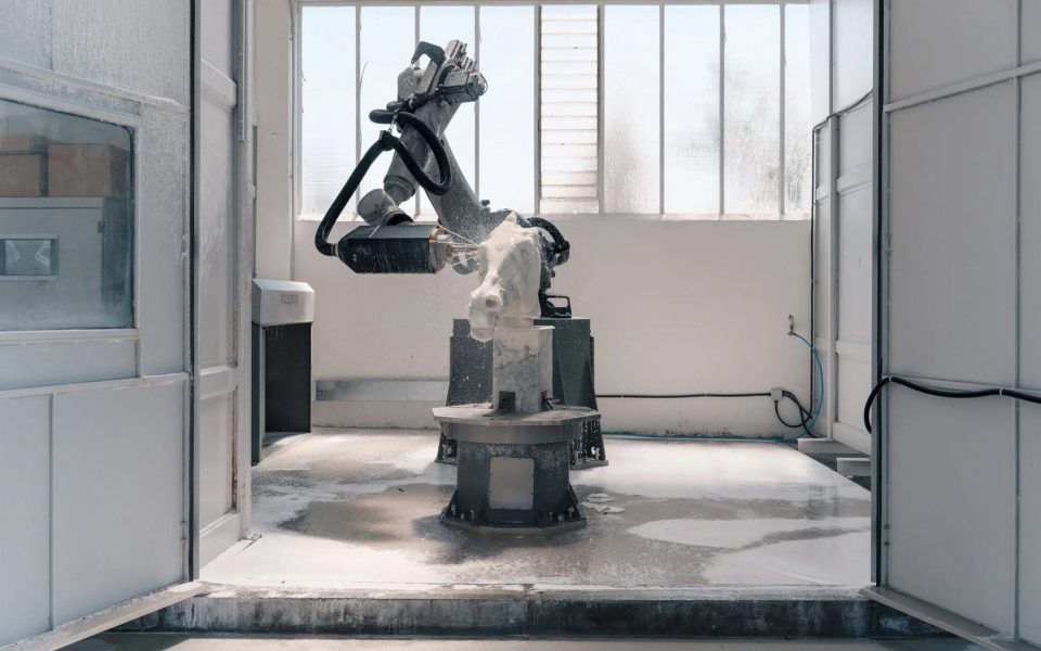 «Η κεφαλή είναι σχεδόν ολοκληρωμένη, θα έχει τελειώσει μέσα σε περίπου δέκα ημέρες. Πρέπει να κάνουμε κάποια φινιρίσματα που γίνονται μόνο με το χέρι. O ρομπoτικός βραχίονας που χρησιμοποιούμε για τη λάξευση του μαρμάρου μπορεί να κάνει την κατασκευή μέχρι ενός σημείου, μετά χρειάζεται ανθρώπινη παρέμβαση», λέει ο Ρότζερ Μάικλ στην τηλεφωνική επικοινωνία μας.