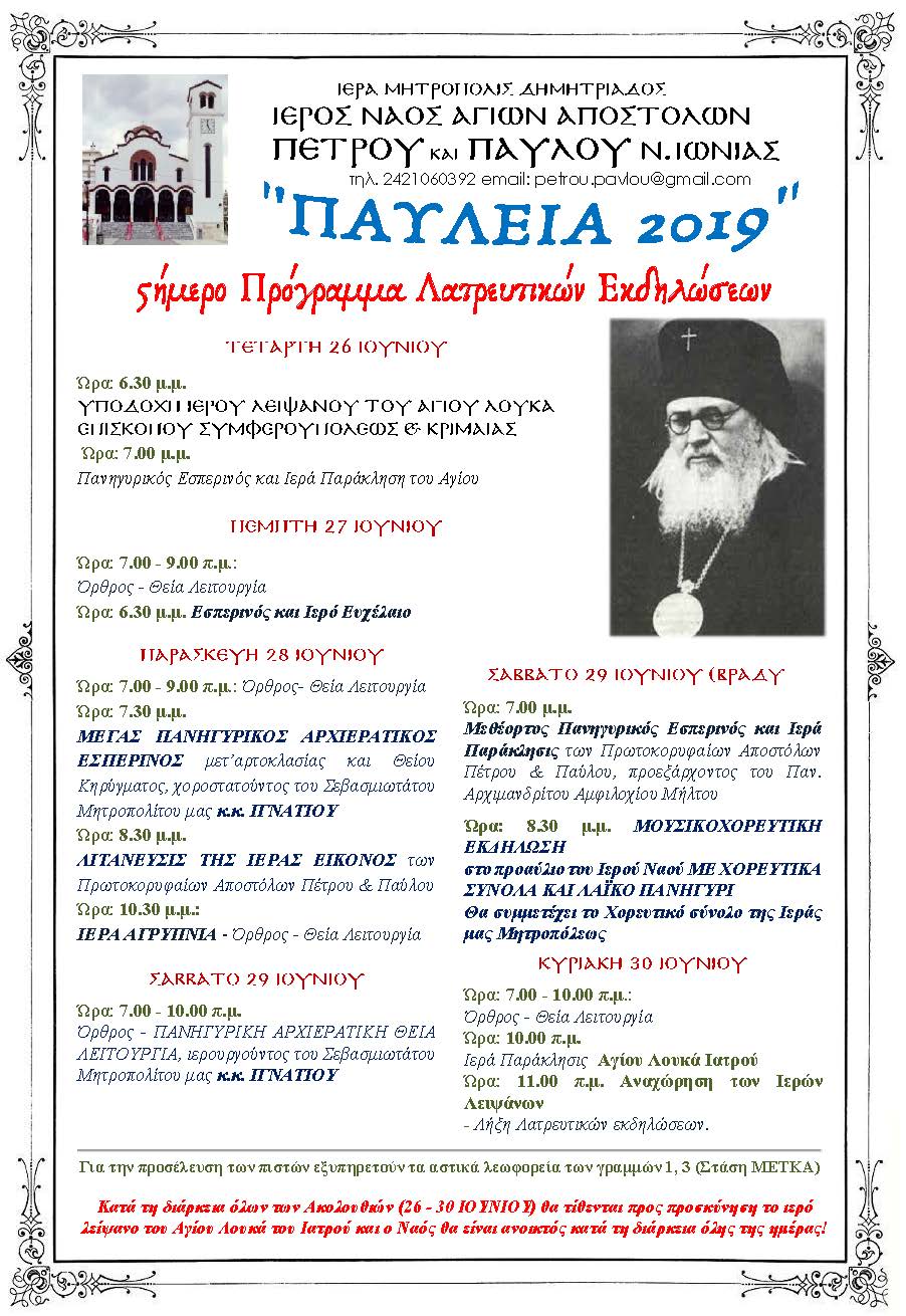 Τα «Παύλεια» 2019 θα διεξαχθούν σύμφωνα με το ακόλουθο πρόγραμμα: