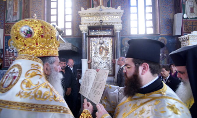 Προ της Απολύσεως, η Ιερά Εικόνα τοποθετήθηκε στο μέσον του Ναού, κατά την Αγιορειτική Τάξη, όπου και θα παραμείνει έως τις 23 Νοεμβρίου, ημέρα κατά την οποία θα ανέλθει και πάλι στο Προσκυνητάριο του Μητροπολιτικού Ιερού Ναού.