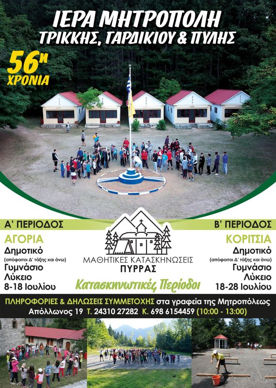 Στην πανέμορφη καταπράσινη περιοχή της Πύρρας, εξήντα χιλιόμετρα από την πόλη των Τρικάλων και σε υψόμετρο 1.200 μέτρων εδώ και πενήντα έξι ολόκληρα χρόνια λειτουργούν ανελλιπώς οι Μαθητικές κατασκηνώσεις της Ιεράς Μητροπόλεως Τρίκκης, Γαρδικίου και Πύλης όπου κάθε καλοκαίρι αγόρια και κορίτσια περνούν μέρες ξεγνοιασιάς σε ένα πανέμορφο περιβάλλον.