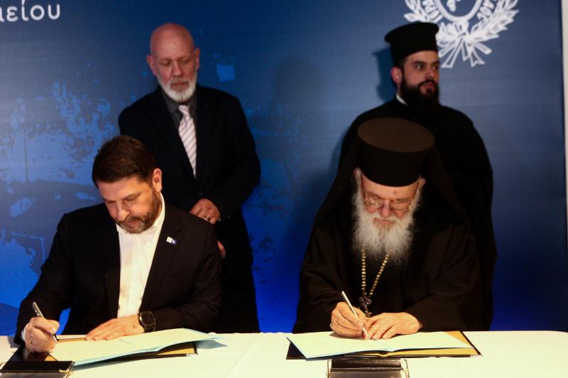 Μετά τους χαιρετισμούς υπεγράφη το Πρωτόκολλο παράδοσης – παραλαβής από τον Μακαριώτατο Αρχιεπίσκοπο Αθηνών και πάσης Ελλάδος κ. Ιερώνυμο και τον Περιφερειάρχη κ. Ν. Χαρδαλιά, οι οποίοι ακολούθως περιηγήθηκαν στα ανακαινισθέντα κτήρια.