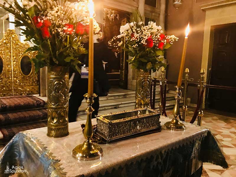 Επέστρεψε στην Κέρκυρα το βράδυ της Δευτέρας 15 Οκτωβρίου 2018 η δεξιά χείρα του Αγίου Σπυρίδωνος του Θαυματουργού, η οποία βρισκόταν στη Ρωσία τις τελευταίες πενήντα ημέρες για ιερό προσκύνημα.