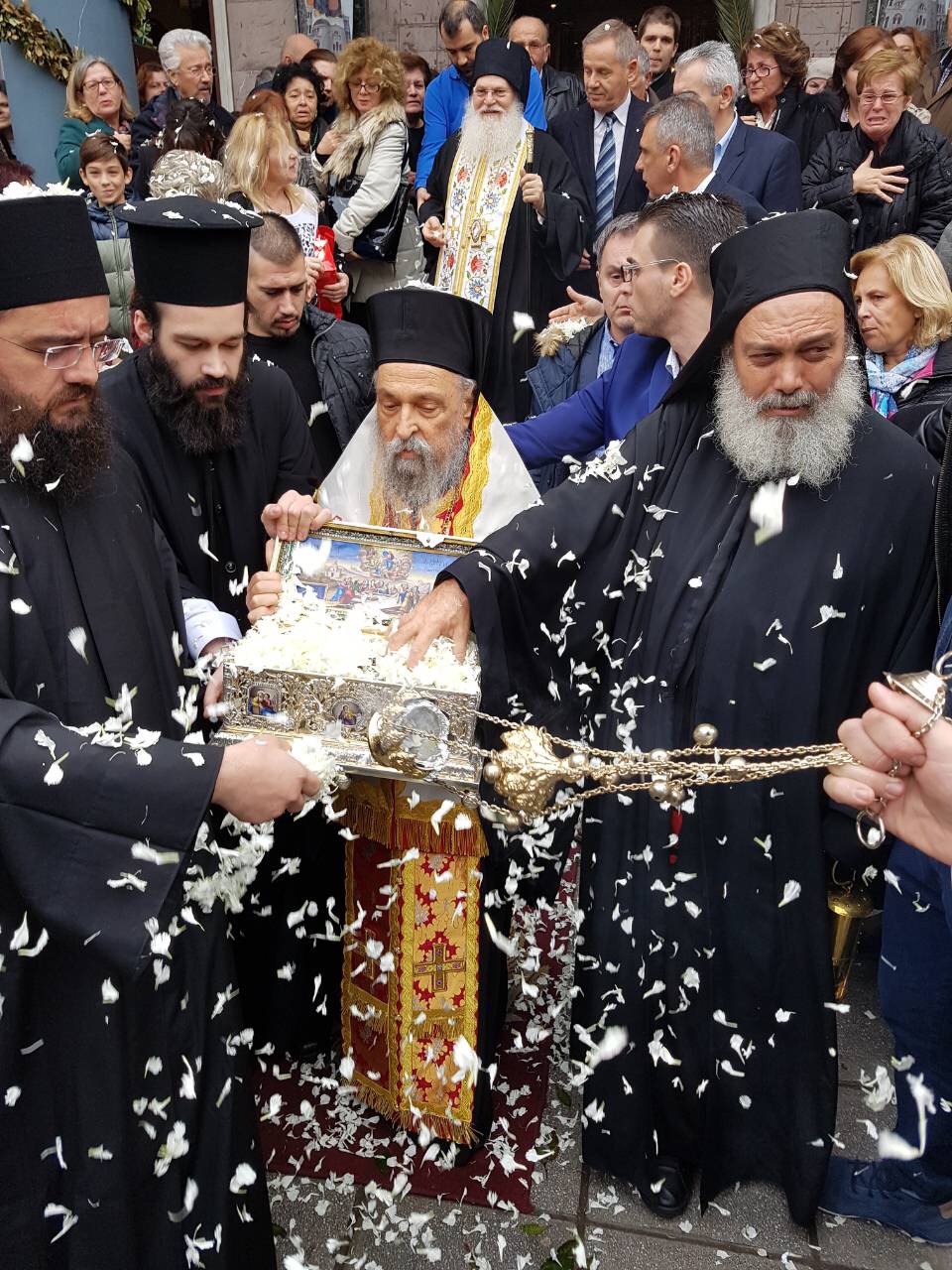 Στη συνέχεια με τις πρέπουσες τιμές η Αγία Ζώνη εξήλθε του Ναού, και ο Σεβασμιώτατος Μητροπολίτης κ.Ιγνάτιος ευλόγησε όλους τους προσκυνητές, διερχόμενος ανάμεσα τους και ευλογώντας αυτούς με την αγία Ζώνη, ενώ αμέσως μετά μεταφέρθηκε η αγία Ζώνη στην 1η Στρατιά, στην Πυροσβεστική και την Αστυνομία προς ευλογία και αγιασμό όλων.
