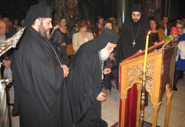 Του Εσπερινού χοροστάτησε ο Καθηγούμενος της Μονής, Σεβ. Μητροπολίτης Θερμοπυλών κ. Ιωάννης, ο οποίος παρέλαβε το Σώμα του Ιησού κι ευλόγησε το λαό.