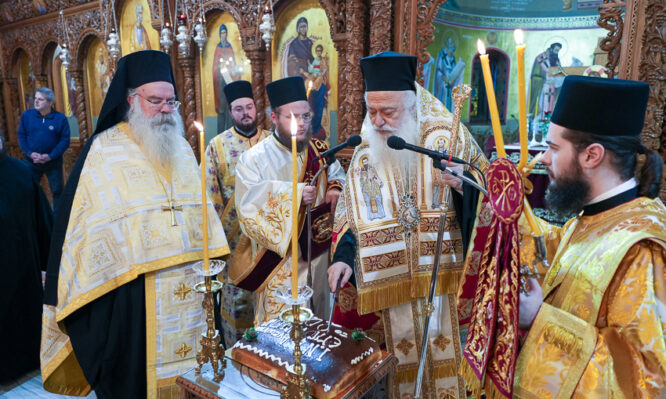 Στο τέλος της ιερής ακολουθίας ο Σεβασμιώτατος διάβασε σχετική ευχή, ευλόγησε την βασιλόπιτα την οποία και διένειμε στους ιερείς και τον πιστό λαό και ευχήθηκε σε όλους καλή και ευλογημένη χρονιά.