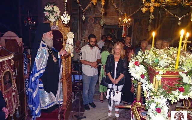 Αφού εψάλλησαν τα εγκώμια της Παναγίας έμπροσθέν του ανθοστόλιστου Επιταφίου της και ευλογήθηκαν οι άρτοι, ο σεπτός Ποιμενάρχης μας απευθύνθηκε προς τους ευλαβείς προσκυνητές, που είχαν κατακλύσει κάθε γωνιά της Μονής, μιλώντας για το θαυμαστό γεγονός της μεταστάσεως της Υπεραγίας Θεοτόκου, ενώ παράλληλα ανέλυσε τον στίχο που αναφέρει: «ἐκάστοις τῶν ἐκλεκτῶν ἡ χάρις κατὰ μέγεθος ἐδόθη, τῇ δὲ Παρθένῳ ἅπαν τὸ τῆς χάριτος πλήρωμα». Ο Σεβασμιώτατος επισήμανε ότι στα θεόπνευστα αυτά λόγια καταδεικνύεται ότι η Παναγία μας είναι ανάμεσα σε όλους τούς Μακαρίους της Εκκλησίας ακηλίδωτος καθρέπτης αγνείας και καθαρότητας. Εκείνοι μερικώς έλαβαν την χάρη και κατά το μέτρο της χάριτος απολαμβάνουν στον Παράδεισο την δόξα, η Παναγία, όμως, στους Ουρανούς είναι δοχείο δεκτικὸ όλης της δόξας, καθὼς στη Γη στάθηκε δοχείο δεκτικὸ όλης της χάριτος.