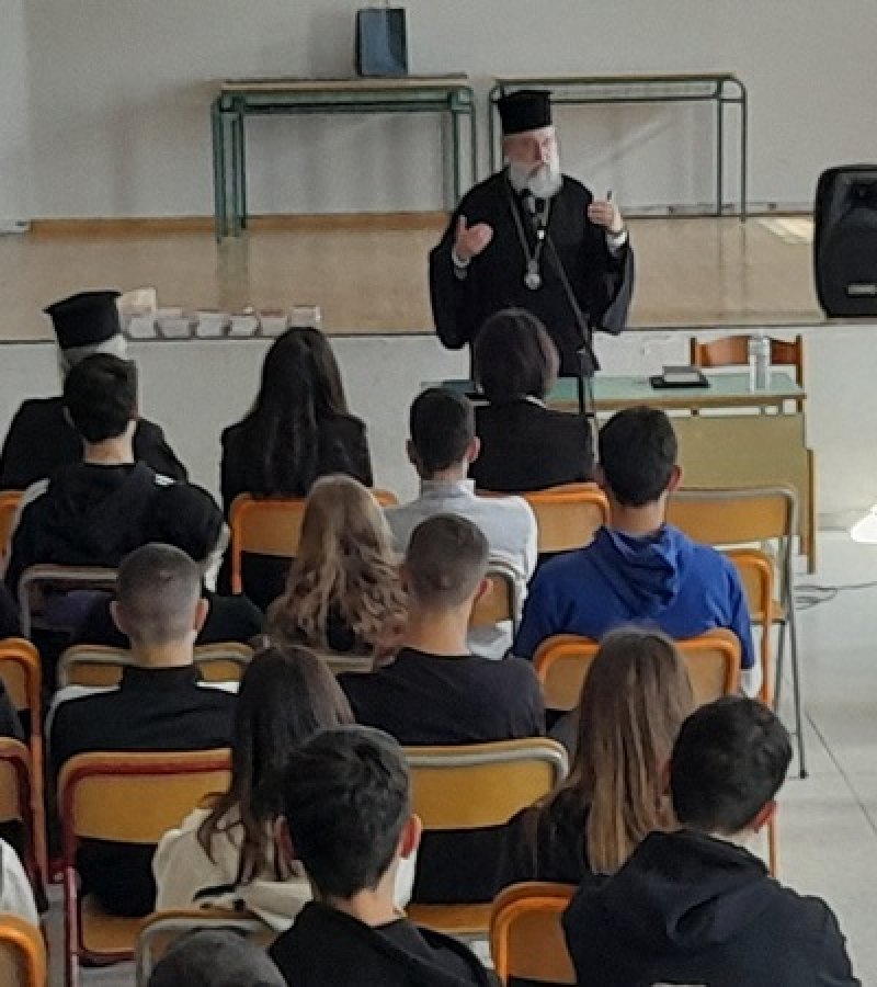 Ἡ σημερινή συνάντηση ἦταν διαφοερετική ἀπό τίς προηγούμενες συναντήσεις τοῦ Σεβασμιωτάτου σέ ἄλλα Γυμνάσια καί Λύκεια τῆς Μητροπόλεώς μας. Ἡ Θεολόγος τοῦ σχολείου εἶχε ζητήσει ἀπό τά παιδιά νά γράψουν μία ἐπιστολή στόν Σεβασμιώτατο μέ ὅ,τι ἀπορίες εἶχαν καί μέ ὅποιο θέμα σχετικῶς μέ τήν Πίστη μας τά ἀπασχολοῦσε. Ὁ Σεβασμιώτατος ἀνένγωσε τίς ἐπιστολές καί χωρίς νά ἀναφέρει τά ὀνόματα τῶν παιδιῶν, ἔδωσε σαφείς καί τεκμηριωμένες ἀπαντήσεις στά ζητήματα πού ἔθεσαν οἱ μαθητές. Στή συνέχεια ἀπήντησε σέ προφορικές ἐρωτήσεις.