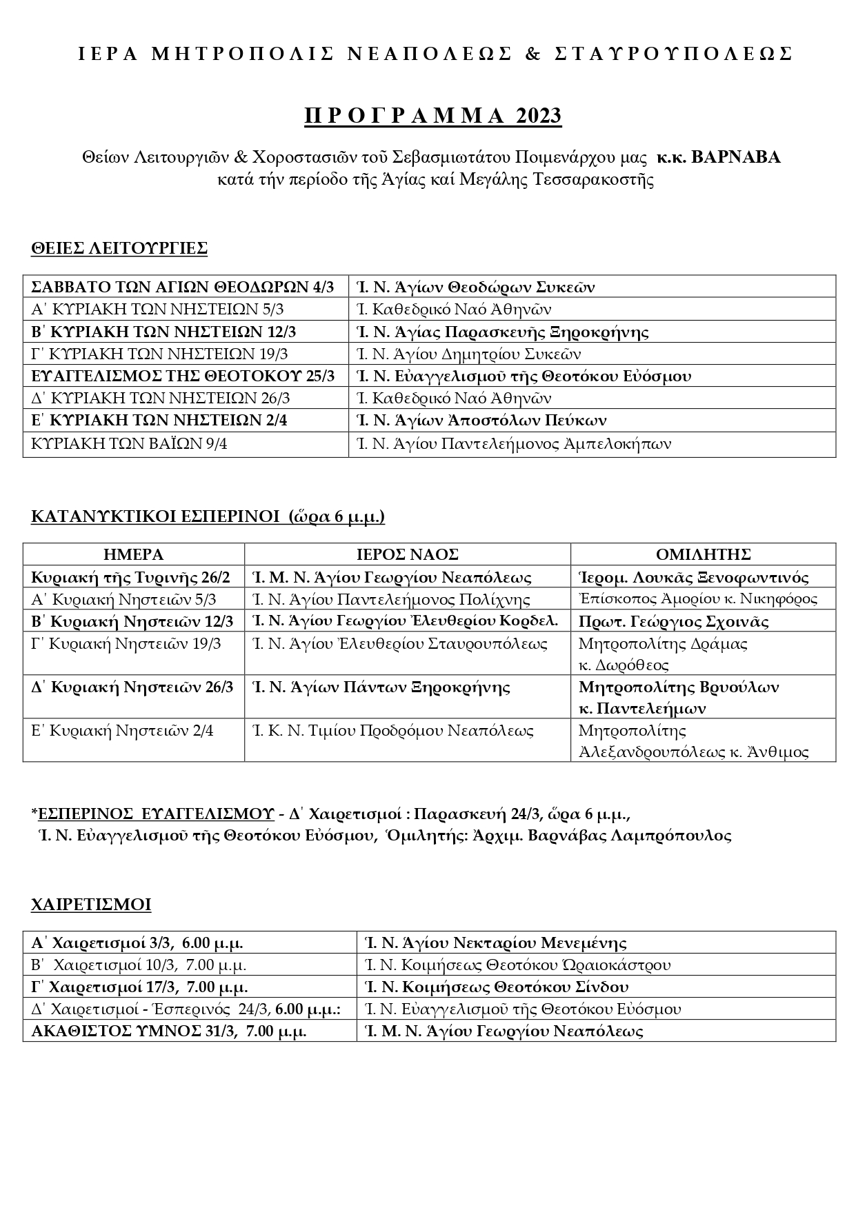 Ο Μητροπολίτης Νεαπόλεως κ. Βαρνάβας, την περίοδο της Μεγάλης Τεσσαρακοστής, θα χοροστατήσει και θα κηρύξει το θείο Λόγο σύμφωνα με το κάτωθι Πρόγραμμα: