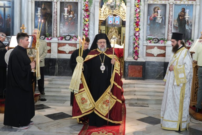 Της Θείας Λειτουργίας προεξήρχε ο εορτάζων Σεβασμιώτατος Μητροπολίτης κ. Ευσέβιος, συλλειτουργούντων των Σεβασμιωτάτων Μητροπολιτών Δημητριάδος κ. Ιγνατίου, Αρκαλοχωρίου κ. Ανδρέα, Σύρου κ. Δωροθέου Β’, Μεσσηνίας κ. Χρυσοστόμου, Καλαβρύτων κ. Ιερωνύμου και Αιτωλίας και Ακαρνανίας κ. Δαμασκηνού.