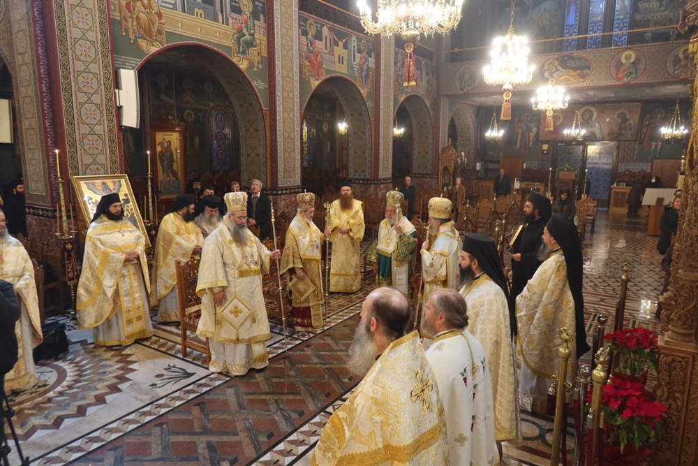 Μετά το πέρας της Ακολουθίας, οι Αρχιερείς μετέβησαν στο Επισκοπείο Κατερίνης και ευχήθηκαν στον Γέροντα Μητροπολίτη Αγαθόνικο.