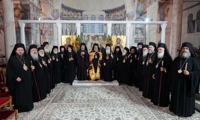 Συμμετείχαν επίσης οι Σεβασμιώτατοι Μητροπολίτες Σεβαστείας κ. Σεραφείμ, Ξάνθης και Περιθεωρίου κ. Παντελεήμων, Άρτης κ. Καλλίνικος, Τρίκκης, Γαρδικίου και Πύλης κ. Χρυσόστομος, Σισανίου και Σιατίστης κ. Αθανάσιος, Λήμνου και Αγίου Ευστρατίου κ. Ιερόθεος, Λαγκαδά, Λητής και Ρεντίνης κ. Πλάτωνας, Πολυανής και Κιλκισίου κ. Βαρθολομαίος, ο Θεοφιλέστατος Επίσκοπος Ευμενείας κ. Ειρηναίος και ο Ποιμενάρχης μας, Σεβασμιώτατος Μητροπολίτης Βεροίας, Ναούσης και Καμπανίας κ. Παντελεήμων, ο οποίος προσκάλεσε αδελφικά τους Αγίους Αρχιερείς για να συμμετάσχουν στην τελετή αναγνώσεως της Συνοδικής και Πατριαρχικής Πράξεως του πνευματικού του πατρός, Αγίου Γερασίμου του Υμνογράφου, που θα πραγματοποιηθεί αύριο κατά την Πολυαρχιερατική Θεία Λειτουργία.