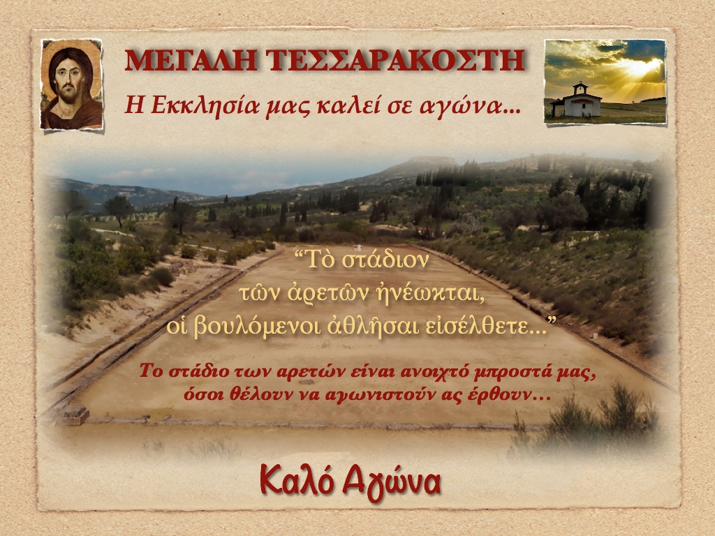 Διὰ τοῦ παρόντος σᾶς γνωρίζομεν, ὅτι καθὼς πλησιάζει ὁ χρόνος τῆς ἐνάρξεως τῆς Ἁγίας καὶ Μεγάλης Τεσσαρακοστῆς, τῆς κατ’ ἐξοχὴν πνευματικῆς περιόδου τοῦ ἐκκλησιαστικοῦ ἔτους, ἡ ὁποία καταλήγει εἰς τὸν Σταυρὸν καὶ τὴν Ἀνάστασιν τοῦ Κυρίου μας Ἰησοῦ Χριστοῦ, προγραμματίζομεν πρὸς τοῦτο ἐκδηλώσεις ὁμιλιῶν κατὰ τὰς Κυριακὰς τῆς περιόδου αὐτῆς, πρὸς πνευματικὸν καταρτισμὸν καὶ ἐνίσχυσιν ὅλων τῶν χριστιανῶν εἰς τὸ πνευματικὸν στάδιον τῆς ἀθλήσεως τῶν ἀρετῶν τῆς ἁγίας μας Ἐκκλησίας.