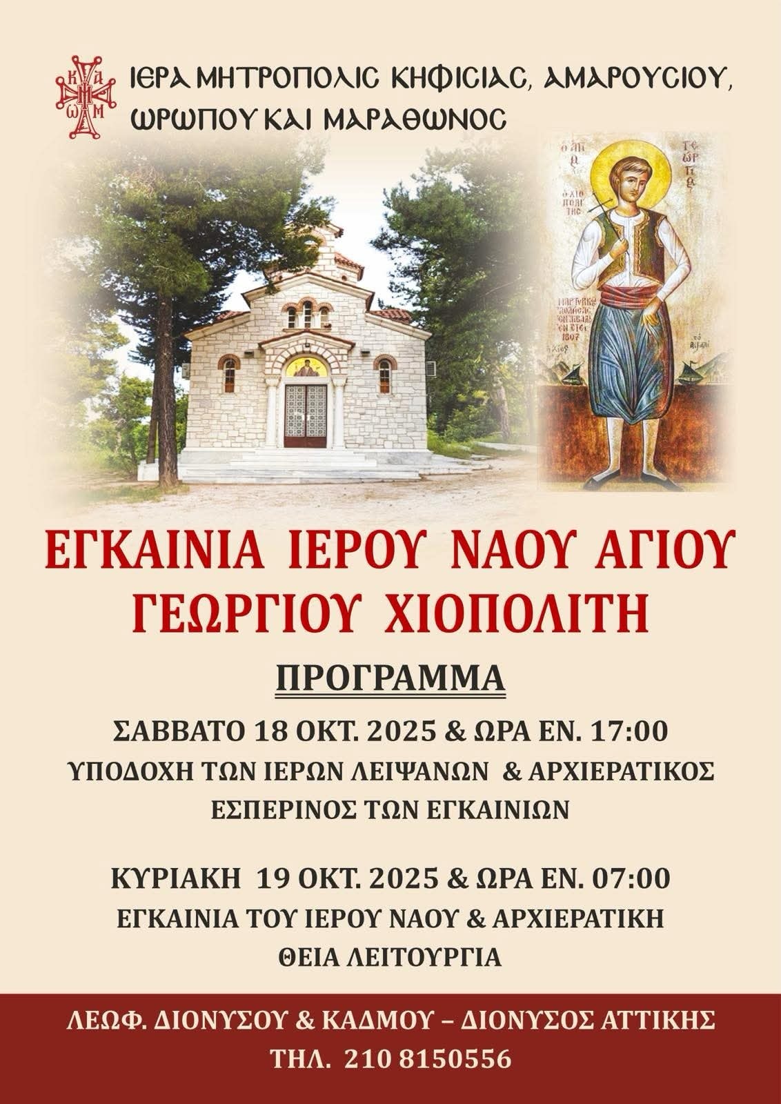 Πρόγραμμα Εγκαινίων Ιερού Παρεκκλησίου Αγ. Γεωργίου Χιοπολίτου Διονύσου ΕΛΛΑΔΑ, ΜΗΤΡΟΠΟΛΕΙΣ 17.10.2025 | 13:45