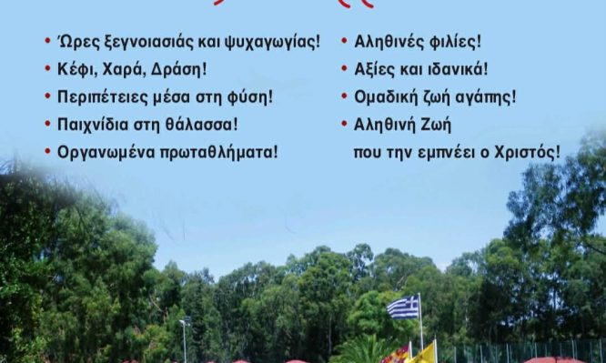 Με δέκα κατασκηνωτικές περιόδους θα λειτουργήσουν το ερχόμενο Καλοκαίρι, οι Κατασκηνώσεις της Ιεράς Μητροπόλεως Αιτωλίας και Ακαρνανίας, στις παραθαλάσσιες εγκαταστάσεις στην περιοχή της Ρίζας Αντιρρίου. Επτά περίοδοι για αγόρια και κορίτσια Δημοτικού, Γυμνασίου, Λυκείου, Φοιτητές και Φοιτήτριες και παιδιά με διαταραχή αυτιστικού φάσματος. Οι συμμετέχοντες θα έχουν την εξαιρετική ευκαιρία να βιώσουν τη χριστιανική ζωή […]