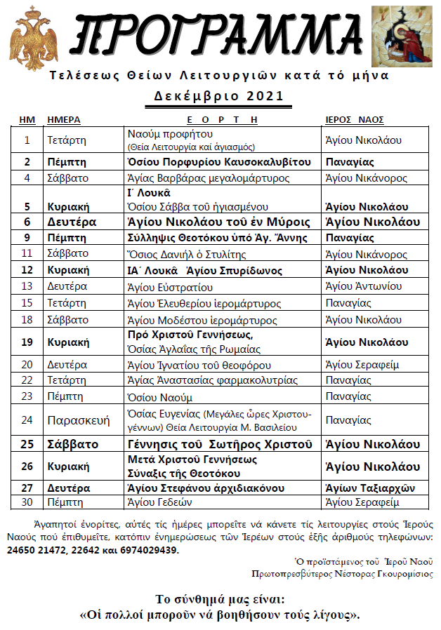 Πρόγραμμα τελέσεως Θείων Λειτουργιών, μηνός Δεκεμβρίου, του Ι. Ναού Αγίου Νικολάου Σιατίστης