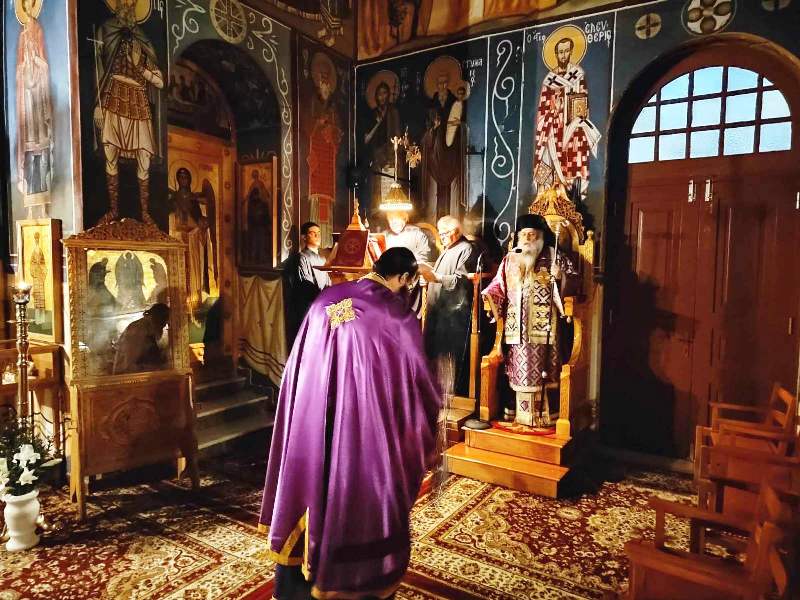 τέλεσε την Προηγιασμένη Θεία Λειτουργία με την συμμετοχή του Εφημερίου του Ιερού Ναού, Πρωτοπρ. π. Εμμανουήλ Τζιώτη. Κατά την διάρκεια του Κοινωνικού τον θείο λόγο κήρυξε ο Ιεροκήρυξ της Ιεράς Μητροπόλεως Αρχιμ. π. Αρσένιος Μελισσιανός ενώ προ του «Δι’ ευχών» ο Σεβασμιώτατος απηύθυνε ευχές προς τους εκκλησιαζομένους για το υπόλοιπο της Αγίας και Μεγάλης Τεσσαρακοστής.