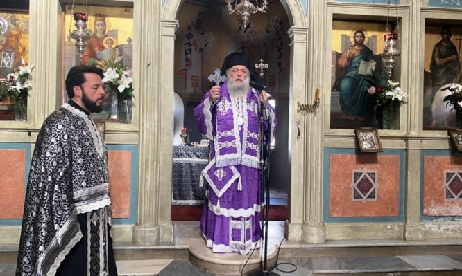 Ο Σεβασμιώτατος προεξήρχε της Προηγιασμένης Θείας Λειτουργίας, πλαισιούμενος από τον Πρωτοσυγκελλεύοντα της Ιεράς Μητροπόλεως, Αρχιμ. Δωρόθεο Βενετσανόπουλο (ο οποίος και κήρυξε τον θείο λόγο).
