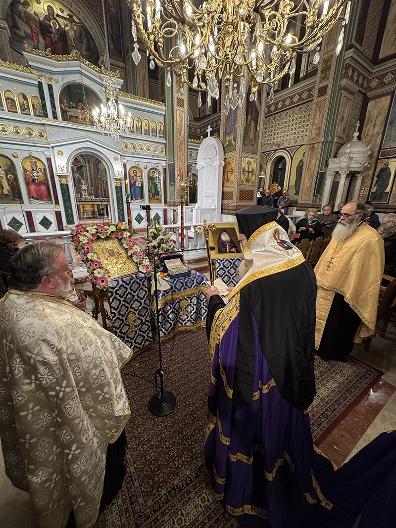 Αλλά μαζί με τους αγίους αγγέλους, κι όλοι οι άγιοι συνεορτάζουν και συνευφραίνονται την εορτή της Θεοτόκου. Και αναφέρθηκε ο Σεβασμιώτατος ιδιαίτερα στον Όσιο Εφραίμ τον Κατουνακιώτη, του οποίου το ιερό λείψανο φιλοξενείται στο Ναό, έναν από τους μεγαλύτερους αγίους των τελευταίων χρόνων.