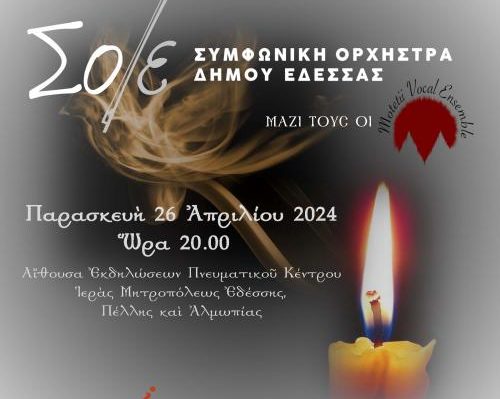Την Παρασκευή 26 Απριλίου 2024 και ώρα 8.00 μ.μ. θα πραγματοποιηθεί η Πασχαλινή Συναυλία της Συμφωνικής Ορχήστρας του Δήμου Έδεσσας.