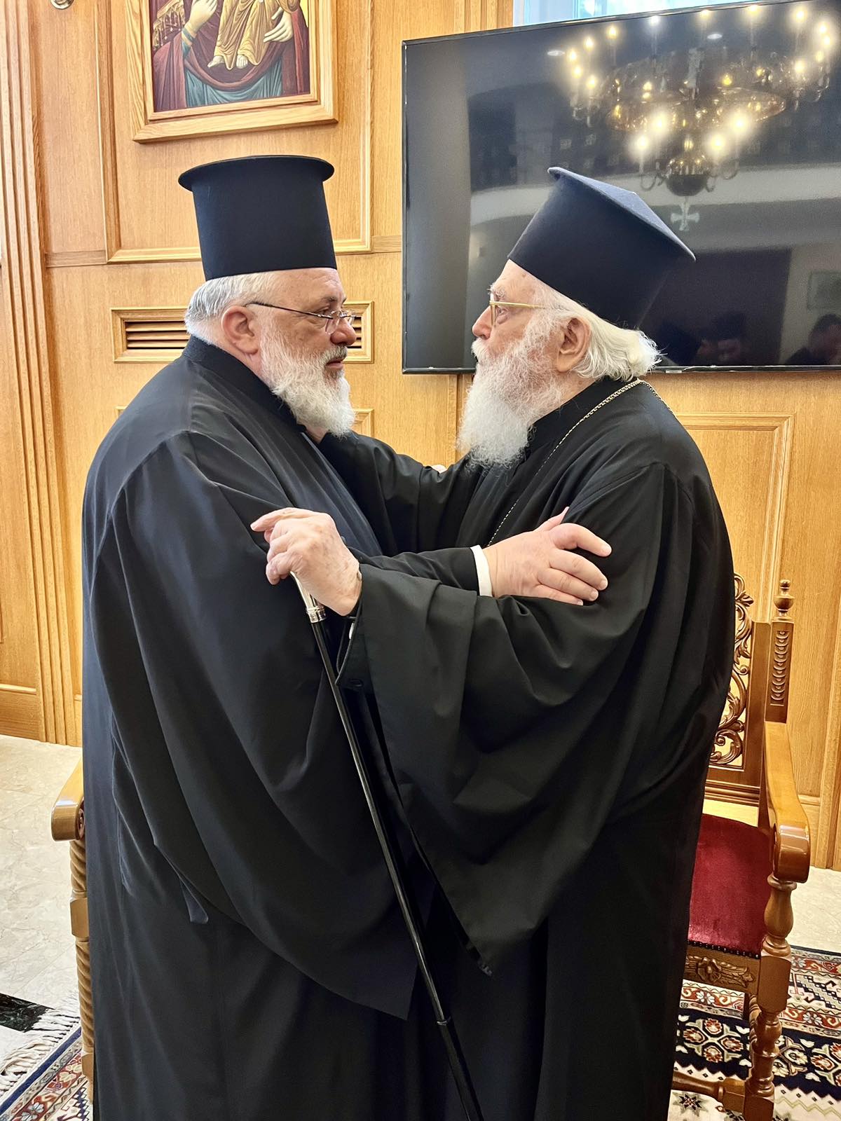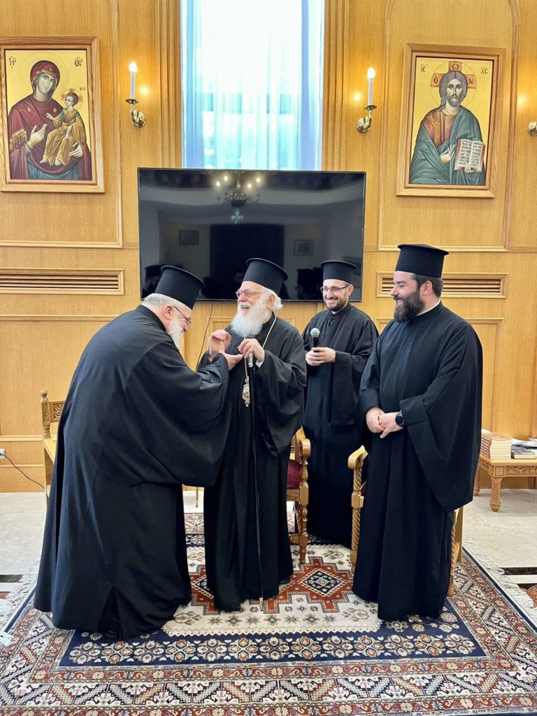 Στα πλαίσια της προσκυνηματικής αυτής επισκέψεως ο Σεβασμιώτατος και ο όμιλος των προσκυνητών είχαν την ευκαιρία να συναντήσουν τον Μακαριώτατο Αρχιεπίσκοπο Τιράνων, Δυρραχίου και πάσης Αλβανίας κ. Αναστάσιο στην αίθουσα του Θρόνου της Ιεράς Συνόδου, παρουσία του Σεβ. Μητροπολίτου Αμαντίας κ. Ναθαναήλ, Αρχιγραμματέως της Ιεράς Συνόδου, και του Θεοφ. Επίσκοπου Βίλλυδος κ. Άστυος, Πρωτοσυγκέλλου της Ιεράς Αρχιεπισκοπής Τιράνων. Ο Μακαριώτατος μίλησε διδακτικώτατα στους προσκυνητές και αναφέρθηκε εκτενώς στο έργο της αναγέννησης της Ορθοδοξίας στην γειτονική αυτή χώρα, μετά την πτώση του κομμουνιστικού καθεστώτος.
