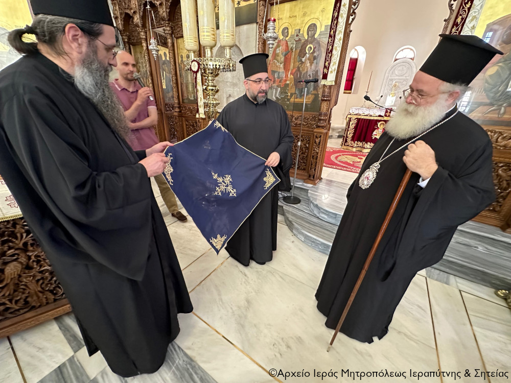 Ο Σεβ. Ιεραπύτνης κ. Κύριλλος καλωσόρισε εγκάρδια τον κρητικής καταγωγής Πανοσιολ. Αρχιμ. και Μέγα Ιεροκήρυκα της Αγίας του Χριστού Μεγάλης Εκκλησίας π. Πανάρετο, τον π. Βίκτωρα, τον ιεροδιάκονο Χρυσόστομο Αγιορείτη και τους προσκυνητές που τους συνόδευαν από την Ορθόδοξη Κοινότητα της Ρωσικής Παροικίας της Πόλεως, η οποία υπάγεται στο Οικουμενικό Πατριαρχείο μας, στο πλαίσιο της φετινής τους ιεραποδημίας στην ηρωοτόκο και αγιοοτόκο Κρήτη. Ο Σεβ. τους μίλησε σύντομα για την ιστορία της Ιεράς Μητροπόλεως, της Ιεράπετρας και για την σπουδαία ιστορία του μνημείου, σημειώνοντας ότι ο σημερινός ναός κτίστηκε από τον αρχιτέκτονα Χατζή-Μανώλη στα μέσα του 19ου αιώνα στη θέση παλιότερου μονόχωρου ενετικού ναού του Αγίου Μεγαλομάρτυρος Γεωργίου, και αποτελεί τον προστάτη και πολιούχο άγιο της Ιεράπετρας, τον σημαντικότερο ναό της πόλης και το σημείο αναφοράς των κατοίκων της από την εποχή την τουρκοκρατίας κατά την οποία μαρτυρούνται θαυμαστές επεμβάσεις του αγίου.