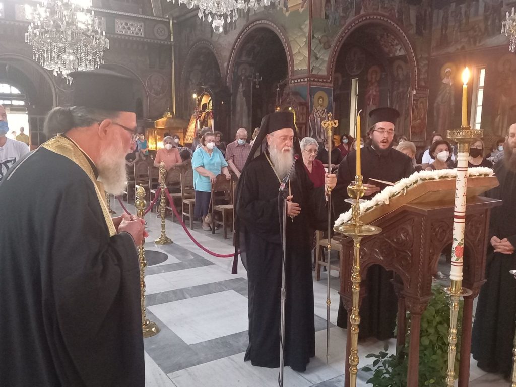 Στους πιστούς ομίλησε επισημαίνοντας ότι, όσες φορές κι αν προσπαθήσουμε να προσεγγίσουμε το Πρόσωπο της Παναγίας και να ερμηνεύσουμε την ζωή και τον ρόλο που έπαιξε στην ενανθρώπηση του Χριστού νομίζω ότι η ανθρώπινη και πεπερασμένη λογική μας φτάνει στο σημείο που καταλήξαμε στην Ι. Ακολουθία, ότι δηλαδή είναι «…ακατανόητον θαύμα, που γαλουχεί τον Δεσπότη». Δεν μπορούμε να κατανοήσουμε τον τρόπο που ο Θεός έγινε άνθρωπος και τον γαλούχησε Εκείνη με τα ανθρώπινα στήθη της, ώστε να έχουμε κι εμείς, κατά τον λόγο του Χριστού, «ζωήν και περισσόν ζωής» (πρβλ. Ιω. ι΄, 10). Η Παναγία μας πρωτοστάτησε σ’ αυτό το ακατανόητο θαύμα, όπως θαυματουργικά ήρθε στον κόσμο, με την προσευχή των γονέων της, θαυματουργικά ετράφει μέσα στον Ναό, όπου ήταν αφιερωμένη, θαυματουργικά απεδέχθη από τον Αρχάγγελο Γαβριήλ το μήνυμα της Σαρκώσεως του Θεού, θαυματουργικά έκλεινε τον αυχένα της ψυχής και του σώματος και είπε «ἰδοὺ ἡ δούλη Κυρίου· γένοιτό μοι κατὰ τὸ ῥῆμά σου» (Λουκ. α΄, 38), θαυματουργικά Τον εκυοφόρησε, χωρίς οδύνες τοκετού και χωρίς να απωλέσει την παρθενία Της, θαυματουργικά υπέμεινε τον Σταυρό και την Ταφή Του, αλλά και θαυματουργικά χάρηκε την Ανάσταση Του. Επίσης θαυματουργικά, τη εντολή του Υιού Της, υιοθετήθηκε από τον μαθητή Του Ιωάννη και δια αυτού του τρόπου μας υιοθέτησε, ως Μητέρα, όλους μας. Θαυματουργικά έφυγε από τον κόσμο, αφού με Ευαγγελισμό, έφερε τον Υιό της στον Κόσμο και με Ευαγγελισμό εισήλθε στον άλλο κόσμο. Είδαμε λοιπόν ότι η Παναγίας μας θαυματουργικά έζησε όλο τον βίο Της, πανηγυρικά οφείλουμε εμείς να εορτάζουμε την Κοίμηση Της καθώς, όπως ψάλουμε στο απολυτίκιο της Κοιμήσεως, «…ἐν τῇ κοιµήσει τόν κόσµον οὐ κατέλιπες, Θεοτόκε».