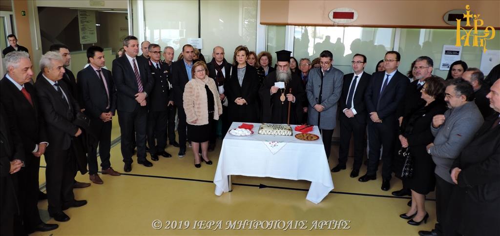 Κατόπιν, ο Σεβασμιώτατος και οι Τοπικοί Άρχοντες έκοψαν την Βασιλόπιτα στο Γενικό Νοσοκομείο Άρτης και ευχήθηκαν στον Διοικητή, κύριο Βασίλειο Μπαλάσκα, για την ονομαστική του εορτή και σε όλο το προσωπικό και τους νοσηλευομένους για την νέα χρονιά.