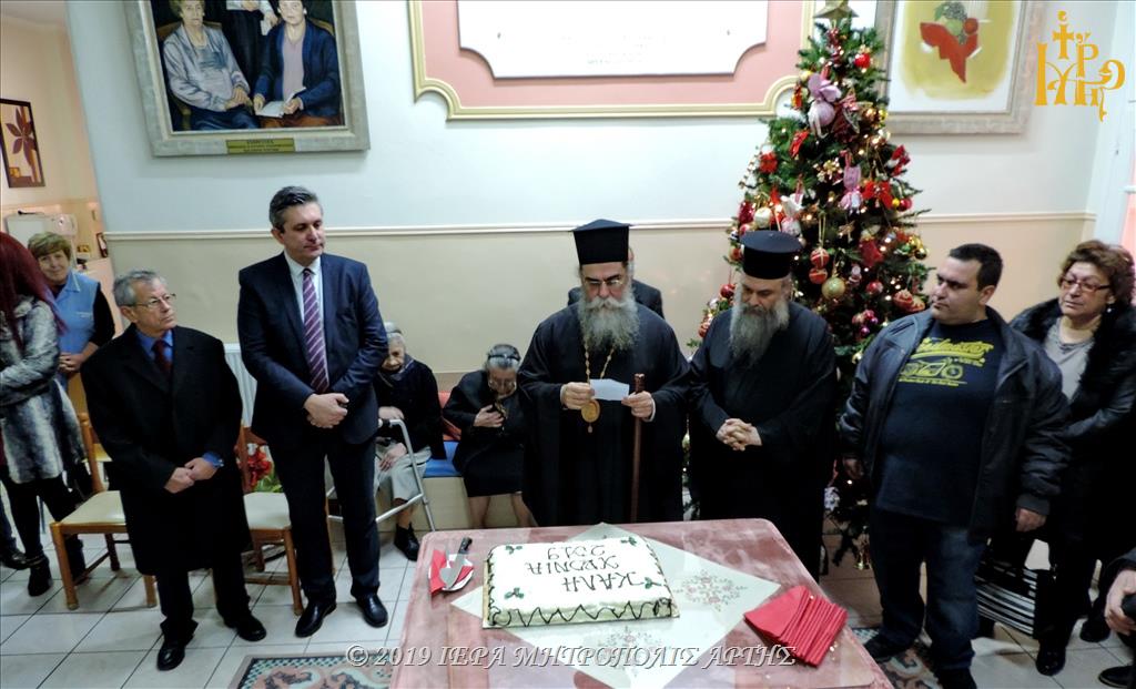 Τέλος, οι επίσημοι πήγαν στο Γηροκομείο «Γεωργίου και Σοφίας Μάτσου», όπου ο Σεβασμιώτατος ευλόγησε την Βασιλόπιτα και ευχήθηκαν στους τροφίμους του Ιδρύματος για το νέο έτος.