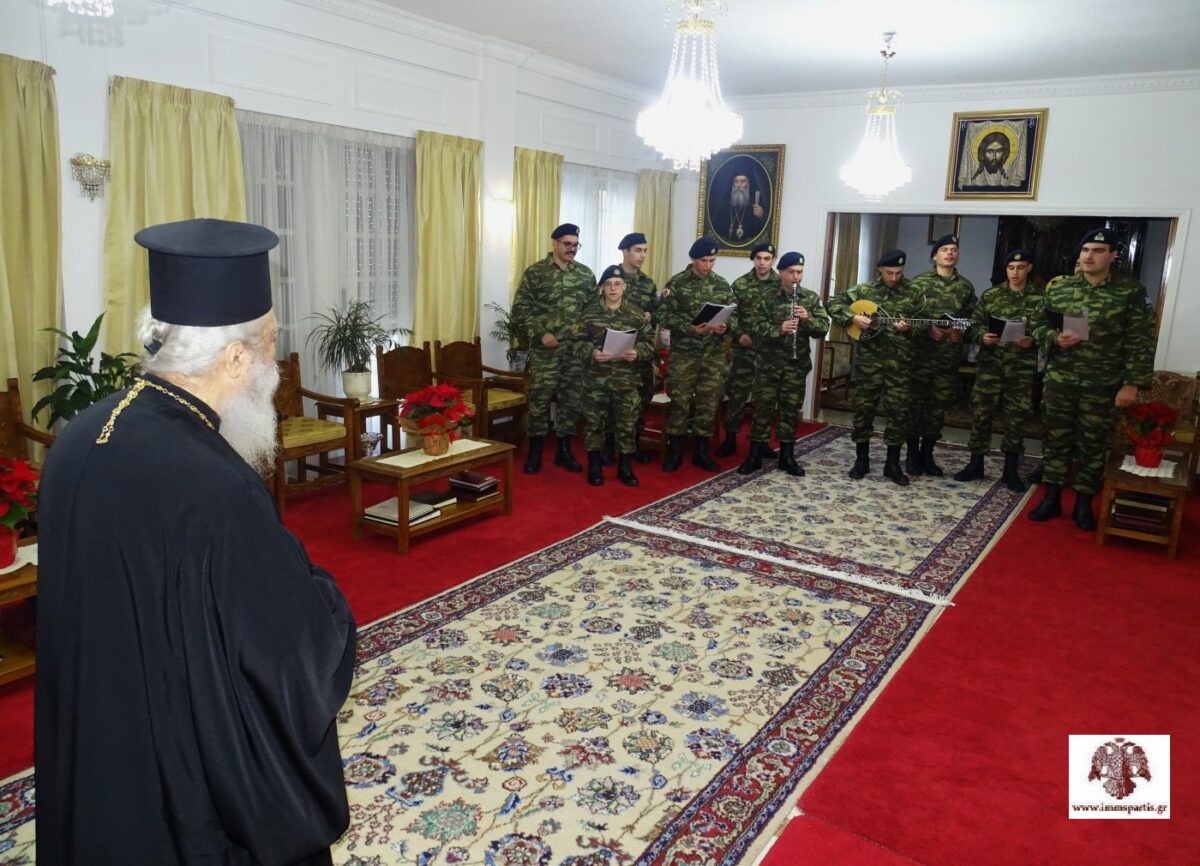 Ως είθισται, το Επισκοπείο επισκέφθηκε χορωδία του Κέντρου Εκπαιδεύσεως Εφοδιασμού Μεταφορών, για να ψάλλει τα Κάλαντα. Ο σεπτός Ποιμενάρχης μας ευχαρίστησε τον επικεφαλής υπαξιωματικό και τους στρατευμένους για την παρουσία τους, ενώ τους ευχήθηκε το νέο έτος να συνοδευτεί από υγεία, χαρά και κατά Θεόν προκοπή για τους ίδιους και τις οικογένειές τους. Ακολούθησε το καθιερωμένο κέρασμα.