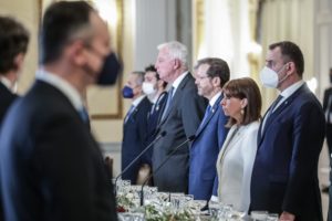 Επίσημο δείπνο είχε η Κατερίνα Σακελλαροπούλου με τον Πρόεδρο του Κράτους του Ισραήλ, Isaac Herzog, στο Προεδρικό Μέγαρο, σήμερα Πέμπτη 24 Φεβρουαρίου.