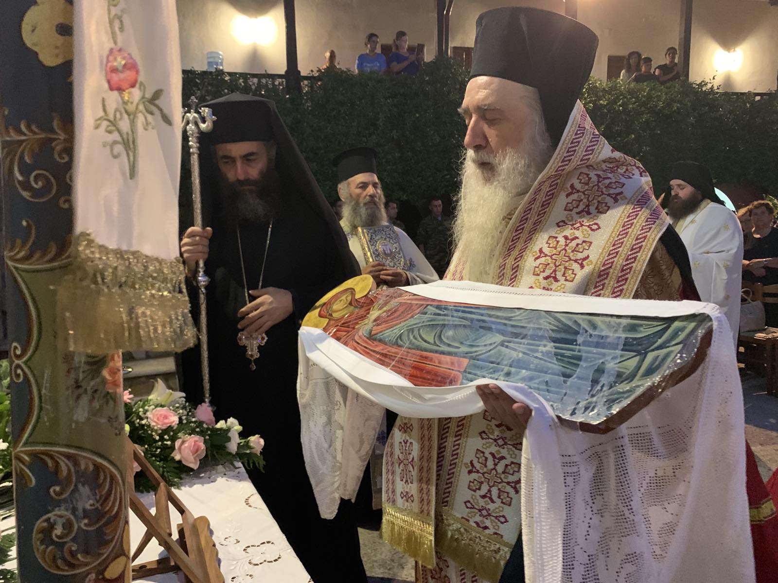 Την Παραμονή της εορτής τελέστηκε υπαίθριος πανηγυρικός Εσπερινός χοροστατούντος του Μητροπολίτη Σάμου κ. Ευσεβίου, εψάλλισαν τα Εγκώμια της Παναγίας και έγινε η περιφορά του Επιταφίου της πέριξ του Καθολικού. Ο Σεβασμιώτατος κάλεσε όλους «να στρέψουμε προς την Παναγία μας τις παρακλήσεις και τις προσευχές μας ώστε με την παντοδύναμη μεσιτεία της να ελκύσει το Θεϊκό έλεος του Υιού της και στην δική μας αμαρτωλή ζωή και να μας οδηγήσει με ασφάλεια στο δρόμο της σωτηρίας και της αγιότητος».