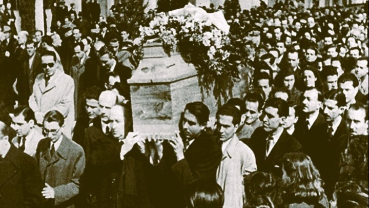 Τελειώνει η λειτουργία και φωνάζει ο Σικελιανός: «Ελάτε κοντά οι νέοι! Εσάς σκεπτόταν ο Παλαμάς όταν έγραφε!». Και τότε, παλληκάρια από το πουθενά ξεπροβάλλουν και παραμερίζοντας τους επαγγελματίες νεκροπομπούς, παίρνουν στους ώμους τους το φέρετρο.
