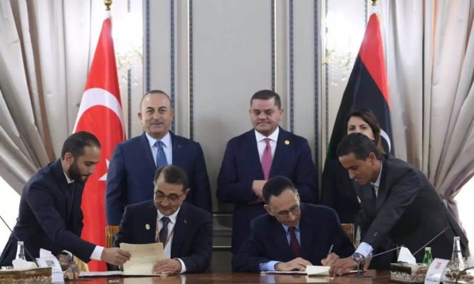 Σε μια τελετή – σόου έβαλαν την υπογραφή τους σε μία συμφωνία η οποία πατά πάνω στο παράνομο Τουρκολιβυκό μνημόνιο που υπέγραψε η Τουρκία με την κυβέρνηση Σάρατζ το 2019.