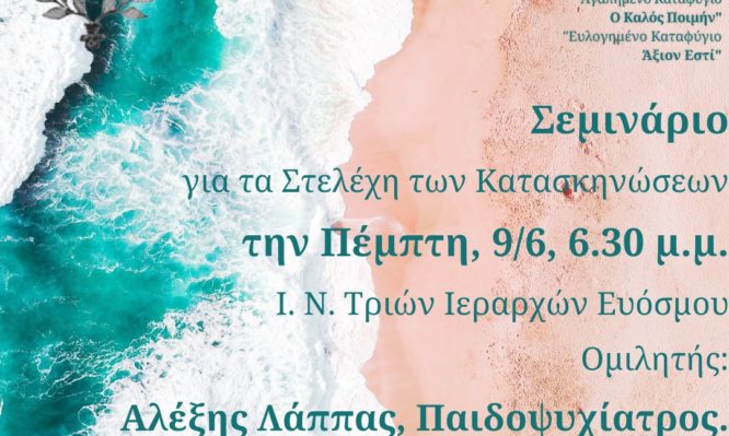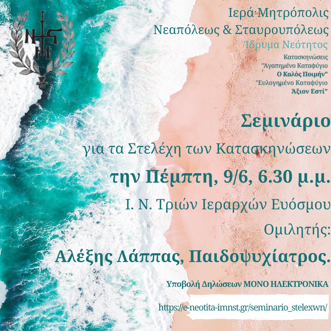 Με την ευλογία του Μητροπολίτη Νεαπόλωες κ. Βαρνάβα, το Ίδρυμα Νεότητας διοργανώνει Επιμορφωτικό Σεμινάριο για τα Στελέχη των Κατασκηνώσεων, την Πέμπτη, 9/6, 6.30 μ.μ. στον Ι. Ν. Τριών Ιεραρχών Ευόσμου, με Ομιλητή τον κ. Αλέξη Λάππα, Παιδοψυχίατρο.